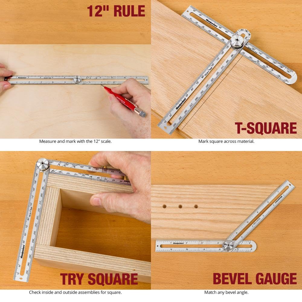 Woodpeckers 12-in-1 Pocket Layout Tool, Inch Model, USA Made Adjustable Square for Woodworking, Stainless Steel, Gauge, Square and Rule in One
