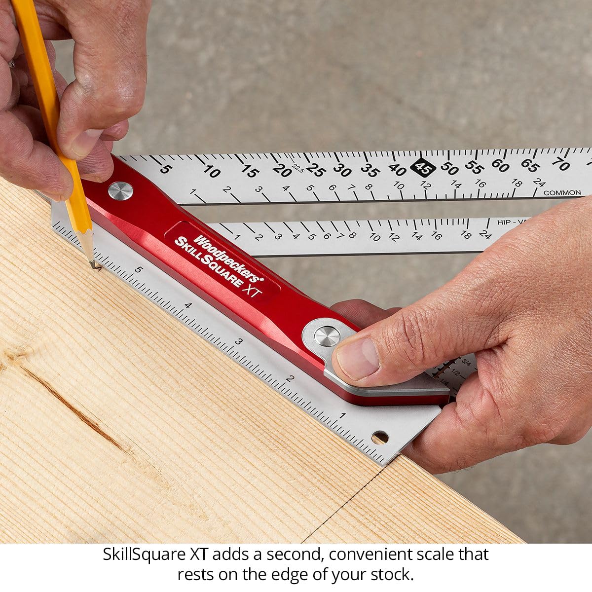 - MADE IN USA - SkillSquare comes in two designs: standard and XT. The XT version features a central core extending beyond the cheeks with a 6" scale on both sides. Flip it to securely hook the extended scale for accurate marking away from board ends.